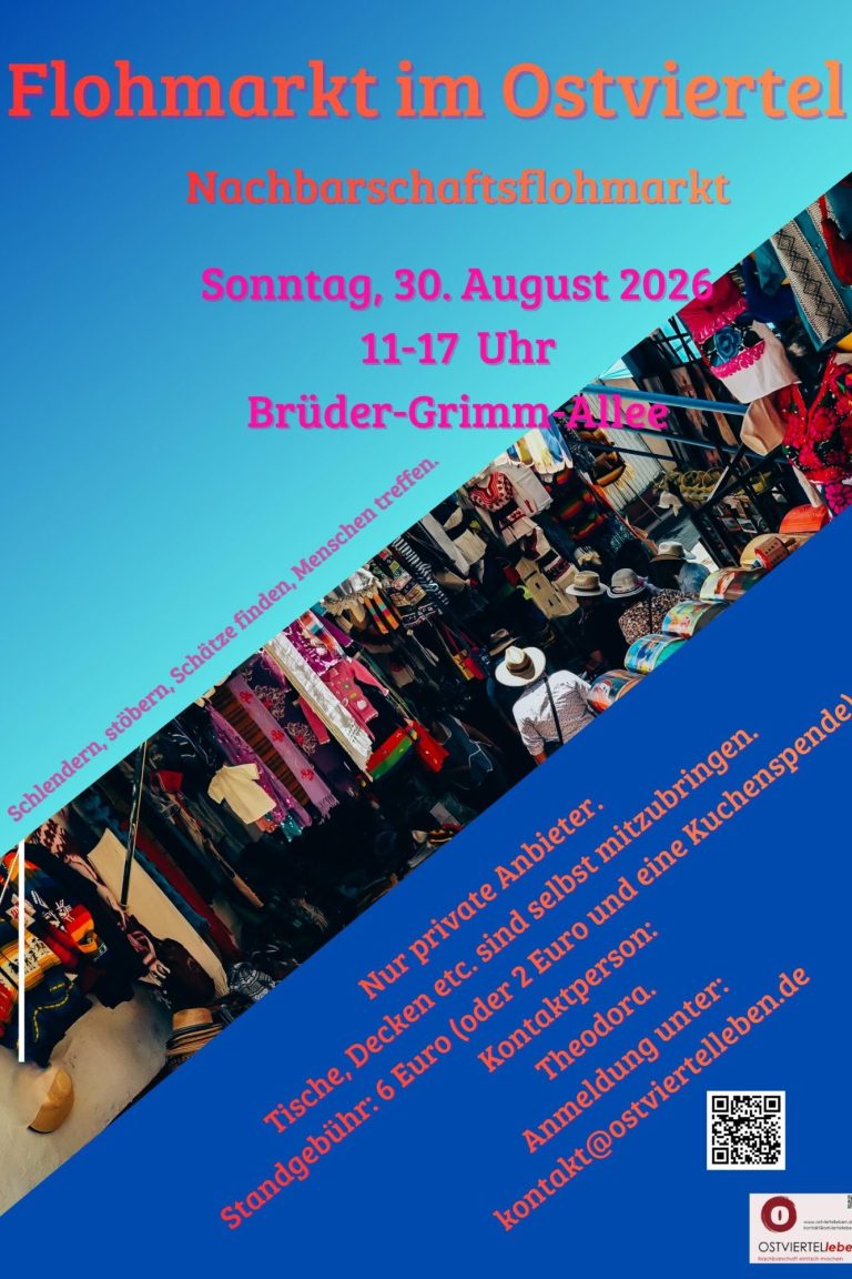 Der Flohmarkt findet wie gewohnt in der Brüder-Grimm-Allee von 11 bis 17 Uhr statt. Alle privaten Anbieter sind willkommen, die Standgebühr beträgt 6 Euro oder 2 Euro und eine Kuchenspende.